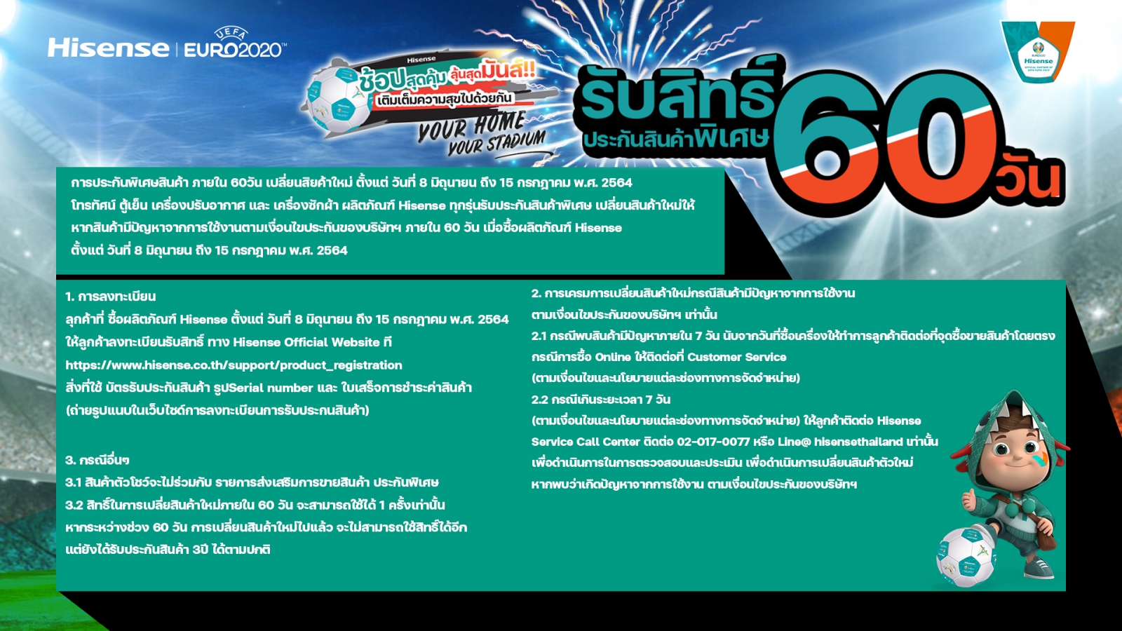การประกันพิเศษสินค้า ภายใน 60วัน เปลี่ยนสิยค้าใหม่ ตั้งแต่ วันที่ 8 มิถุนายน ถึง 15 กรกฎาคม พ.ศ. 2564 โทรทัศน์ ตู้เย็น เครื่องปรับอากาศ และ เครื่องซักผ้า ผลิตภัณฑ์ Hisense ทุกรุ่นรับประกันสินค้าพิเศษ เปลี่ยนสินค้าใหม่ให้ หากสินค้ามีปัญหาจากการใช้งานตามเงื่อนไขประกันของบริษัทฯ ภายใน 60 วัน เมื่อซื้อผลิตภัณฑ์ Hisense ตั้งแต่ วันที่ 8 มิถุนายน ถึง 15 กรกฎาคม พ.ศ. 2564