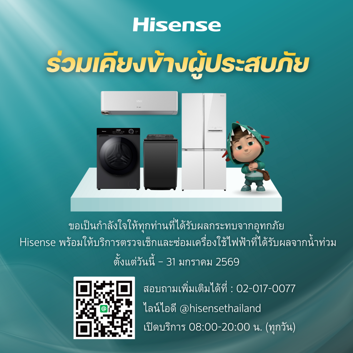 บริษัท Hisense Thailand ขอเป็นกำลังใจให้กับประชาชนทุกท่านที่ได้รับผลกระทบจากสถานการณ์น้ำท่วมในพื้นที่ภาคใต้ โดยเฉพาะจังหวัดที่ได้รับผลกระทบอย่างหนัก เพื่อช่วยบรรเทาความเดือดร้อนของลูกค้า บริษัทฯ พร้อมมอบ บริการตรวจเช็กและซ่อมเครื่องใช้ไฟฟ้า Hisense ที่ได้รับความเสียหายจากน้ำท่วม โดยไม่มีค่าใช้จ่ายในการตรวจซ่อมถึงบ้าน และมอบส่วนลดค่าอะไหล่ 50% ตลอดระยะเวลาการช่วยเหลือ