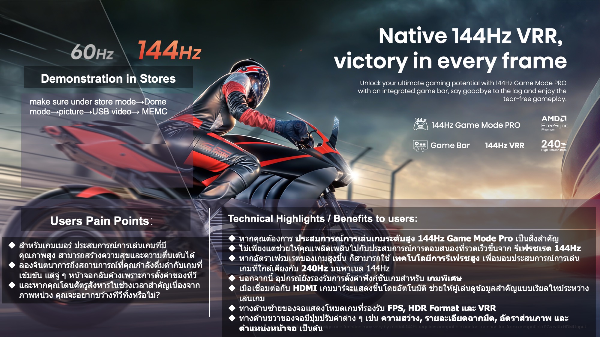 -144Hz + MEMC : ภาพลื่นไหล ไม่เบอล เหมาะกับเกมและกีฬา