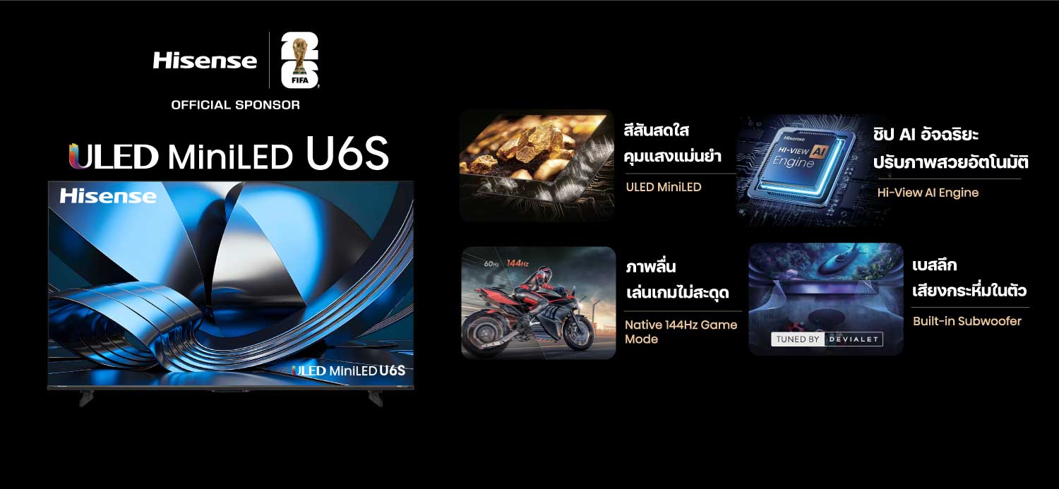 ทีวี Hisense U6S ULED MiniLED มาพร้อมเทคโนโลยี ULED MiniLED ที่ช่วยยกระดับความสว่างและคอนทราสต์ ให้ภาพคมชัด สีสันสมจริงในทุกมุมมอง